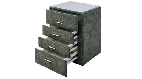 Der weiche Stoffbezug mit feiner Struktur sorgt für eine warme, wohnliche Atmosphäre. Die Kombination mit der transparenten Glasplatte wirkt hochwertig und modern – ideal für ein gemütliches und gleichzeitig elegantes Schlafzimmer. Vier leichtgängige Schubladen mit chromfarbenen Griffen bieten dir viel Platz für Alltagsgegenstände, Kleidung oder Accessoires. So schaffst du ganz einfach Ordnung mit Stil.
