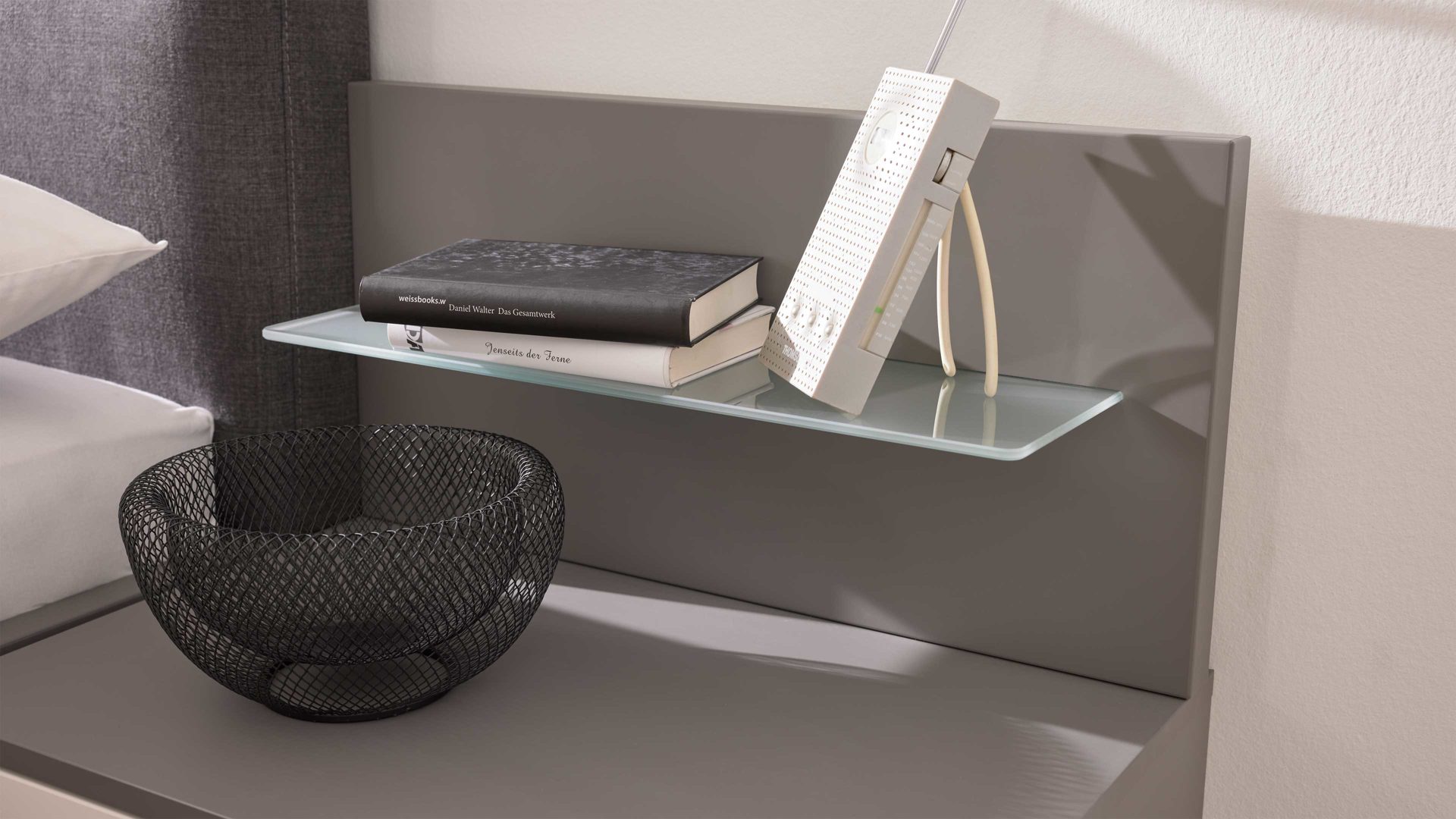 Mit Maßen von ca. 60 x 30 x 18 cm (BxHxT) bietet der Aufsatz eine zusätzliche Ablagefläche, ideal für Bücher, Deko oder kleine Alltagsgegenstände. Er wird rechtsseitig neben dem Bett, oberhalb der Hänge-Nachtkonsole, montiert und fügt sich nahtlos in das moderne Design der Serie ein.