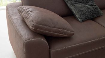 Durch die Kaltschaumpolsterung auf einer stützenden Wellenunterfederung sitzen Sie auf der Couchlandschaft sehr bequem. Sie besteht aus dem 2,5-Sitzer 2,5L mit Armlehne und nesselbezogener Rückseite links und dem 1-sitzigen Kombielement 1KOR mit offenem Abschluss und stoffbezogener Rückseite rechts.