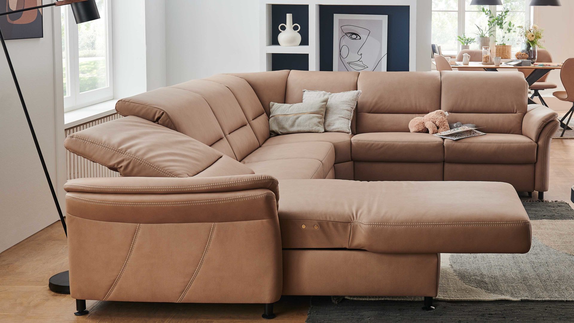 Das Programm bietet eine beeindruckende Typen- und Bezugvielfalt, wobei alle Rückseiten im Originalstoff bezogen sind und die Bezüge wahlweise mit oder ohne Kontrastnaht umgesetzt werden können. Überdies stehen sieben Fußvarianten, zwei preisgleiche Sitzhöhen und mit Kaltschaum, Federkern und - gegen Aufpreis - Boxspring drei Sitzqualitäten zur Wahl.