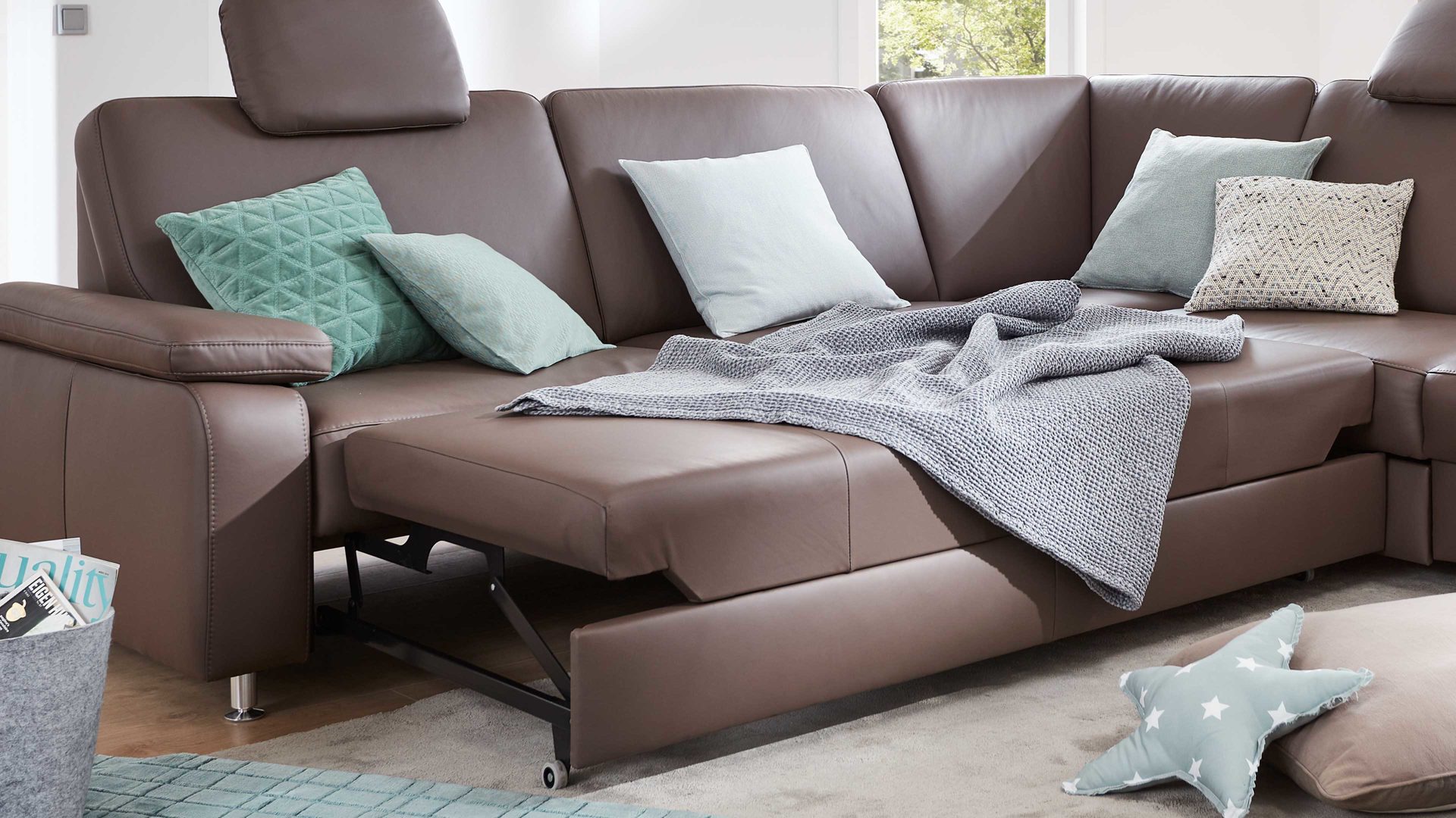 Die Bettfunktion A ist eine Mehrpreis-Ergänzung für die 2,5-Sitzer ohne Armlehnen aus dem Modulmaster-Programm MM-PN1059. Sie gibt Ihnen die Gelegenheit, das jeweilige Sofa über den verchromten Metallgriff nach vorne auszuziehen und die Sitzfläche um ca. 112 x 123 cm (LxB) zu erweitern. Die Liegefläche der Querschläfer-Bettfunktion ist mit Nesselstoff bezogen, gegen Mehrpreis allerdings auch im Originalstoff lieferbar.