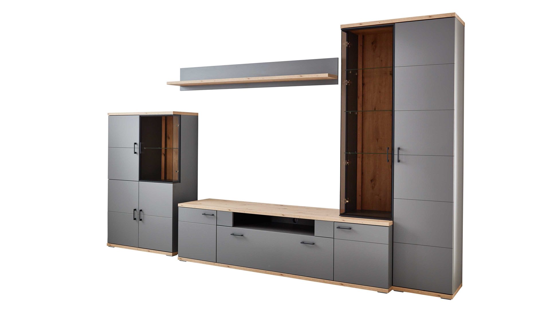 Erleben Sie das einzigartige Wohngefühl mit der Wohnwand Houton. Mit ihren grauen Kunststoff-Oberflächen strahlt sie eine zeitlose Eleganz aus, die in jedem Raum für einen stilvollen Blickfang sorgt. Der Korpus verfügt über graue Melaminoberflächen, die nicht nur stoß- und kratzfest, sondern auch lichtbeständig sind. Die Absetzungen in Dekor Eiche Artisan verleihen der Anbauwand einen natürlichen Touch und sorgen für Gemütlichkeit. Die sichtbaren Rückwände in Optik Eiche sandgestrahlt setzen zudem spannende Akzente.