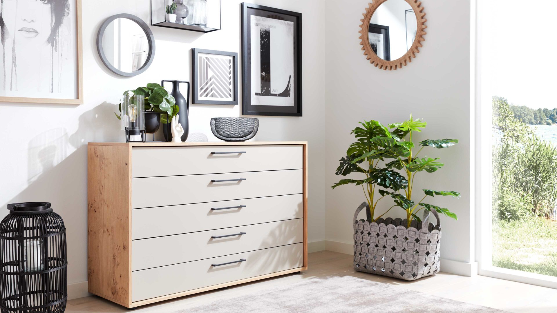 Mit Maßen von ca. 124 x 82 x 46 cm (B/LxHxT) bietet sie großzügigen Stauraum. Die fünf Schubladen sind mit Selbsteinzug und Soft-Abstoppung ausgestattet, was für ein angenehm leises und komfortables Schließen sorgt. Jede Schublade ist zudem bis maximal 20 kg belastbar, sodass du Kleidung, Wäsche oder Accessoires sicher und ordentlich verstauen kannst. Der innen weiß lackierte Korpus sorgt für eine helle, saubere Innenoptik.