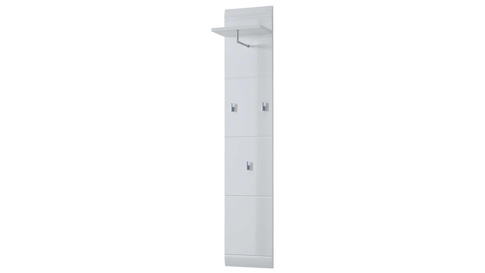 Verleihen Sie mit diesem Garderobenpaneel Ihrem Eingangsbereich eine einladende Atmosphäre und schaffen Sie gleichzeitig eine stilvolle Möglichkeit zur ordentlichen Kleideraufbewahrung. Die Wandgarderobe präsentiert sich mit einem Korpus aus MDF mit weißer Hochglanzoberfläche und auffällig schöner Rillenfräsung. Dabei bieten der Ablageboden, die Kleiderstange sowie drei Kleiderhaken ausreichend Platz für Ihre Kleidung. Jacken, Schals und Mäntel hängen Sie knitterfrei auf, während Sie Hüte und Mützen auf der oberen Ablagefläche des Dielenmöbels verstauen.