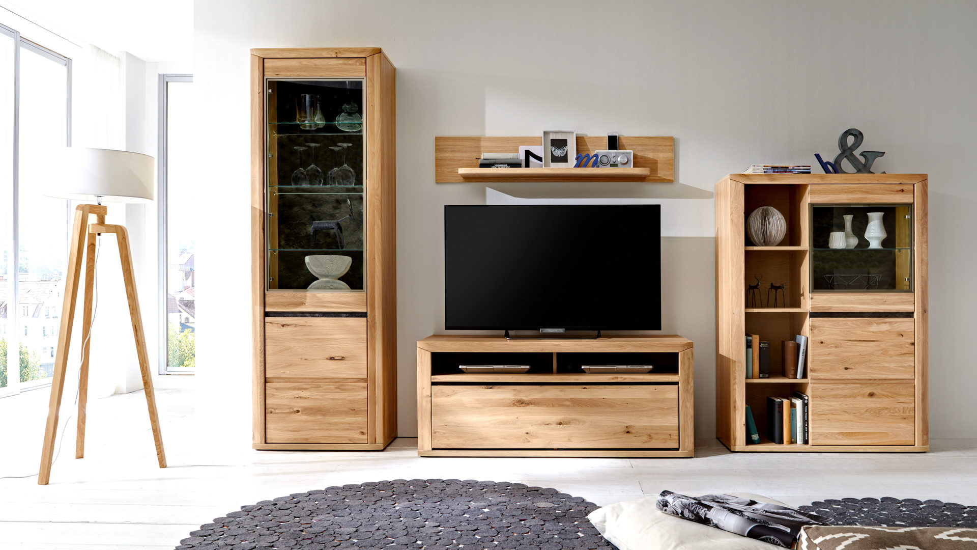 Die ca. 330 x 206 x 50 cm (BxHxT) große Wohnkombination besteht aus einem Highboard, dessen Türen Glasausschnitte, zwei Holzböden und einen Glasboden hat; ein Wandregal mit Rückwand in sägerauer Eiche-Nachbildung und arcticweißem Regalboden und einem Lowboard, in dessen zwei Schubladen Sie allerhand verstauen können. In diesen Aufbewahrungsmöbeln bringen Sie Gläser, Vasen, Bücher und Wohnaccessoires ordentlich und staubfrei unter. Ihren Fernseher platzieren Sie mittig auf dem TV-Unterteil. In der eintürigen Vitrine finden Gläser und viele andere Dinge ihren Platz.