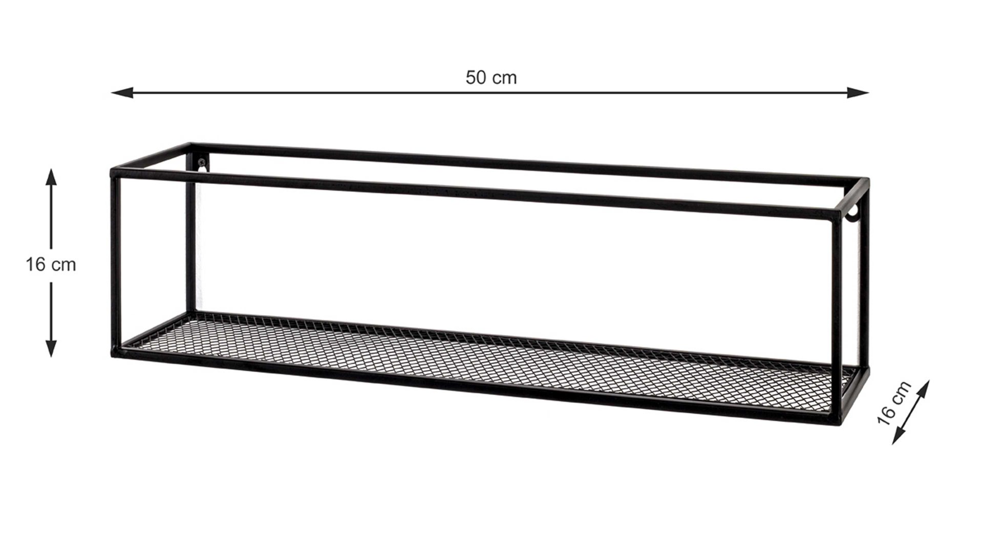 Dieses hochwertige Wandregal repräsentiert die Eleganz schlichter Modernität. Aus einem klassisch mattschwarz lackierten Metallgeflecht und Vierkantrohr-Metallrahmen gefertigt, erscheint es puristisch und ist dazu enorm robust und langlebig. Seine Maße betragen ca. 50 x 16 x 16 cm (LxHxT).