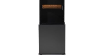 Mit den schwarzgrau lackierten Melaminoberflächen und der akzentuierenden Absetzung in furnierter, geölter Risseiche präsentiert sich die qualitativ hochwertige Vitrine aus dem Wohnmöbelprogramm Messina betont modern designt. Die graue Parsolverglasung und der schlichte schwarzgraue Metallgriff runden die stilvolle Optik harmonisch ab.