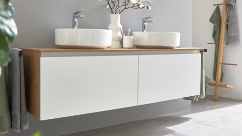 Das Set beinhaltet zwei Waschtischschränke (Typ 67447), die jeweils mit einer Innenblende, einem großzügigen Auszug und einer Holzrückwand ausgestattet sind. Maße pro Schrank: ca. 80 x 43 x 46 cm (B/LxHxT). Die Auszüge sind mit komforttablem Soft-Close und Selbsteinzug ausgestattet. Gegen Mehrpreis kannst du Glas-Seitenwände erhalten. Ergänzt werden sie durch zwei runde, weiße Keramik-Aufbauwaschtische (Typ 87732) mit Hahnlochbohrung und Überlauf. Maße: Durchmesser ca. 45 cm, Höhe ca. 15 cm.