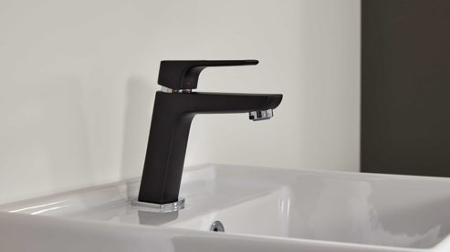 Der weiße Keramik-Möbelwaschtisch (Typ 87730) mit Hahnlochbohrung und Überlauf ist pflegeleicht und kompakt. Mit Maßen von ca. 43 x 19 x 39 cm (BxHxT) passt er perfekt in moderne Bäder. Ergänzt wird er durch die mattschwarze Einhand-Mischbatterie (Typ 17718) mit Chrom-Details, die dank Luftsprudler (24 mm Durchmesser), flexibler Anschlussschläuche und Zugstangen-Ablaufgarnitur nicht nur praktisch, sondern auch besonders komfortabel ist. Maße: ca. 12 x 15 cm (BxH).