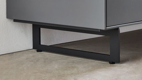 graphitgrauer Mattlack, kombiniert mit massivem soft gebürstetem Spaltholz und carbonfarben pulverbeschichtetem Metall