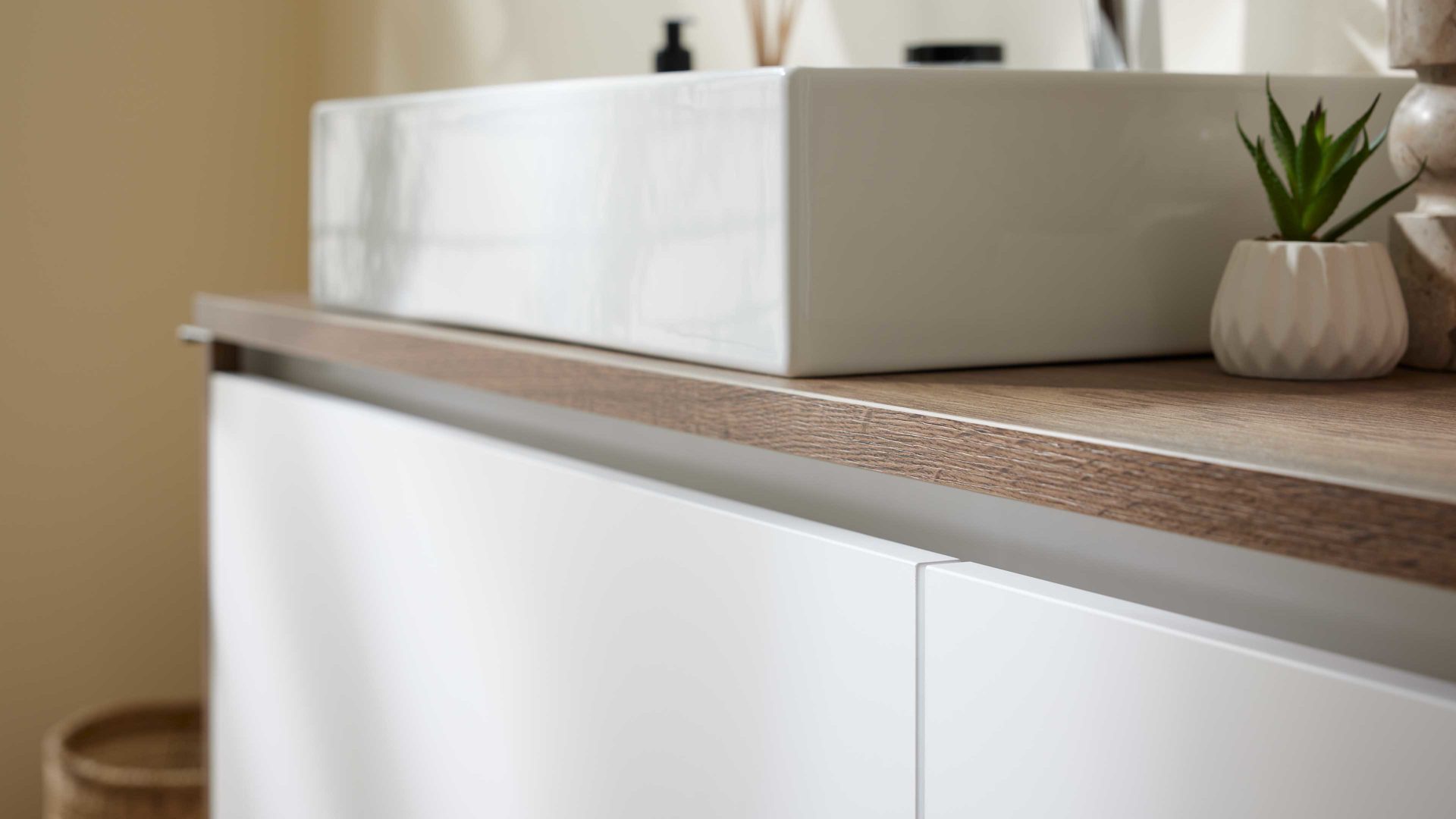 Das Basis-Set vereint Design und Funktion auf besonders harmonische Weise. Der Waschtischunterschrank (Typ 67337) bietet mit seinem geräumigen Auszug und der Rückwand mit Siphon-Ausschnitt praktischen Stauraum für deine täglichen Badutensilien. Er wird inklusive Abschlusswange (Typ 16786) geliefert. Mit Maßen von ca. 90 x 36 x 46 cm (B/LxHxT) fügt er sich optimal in unterschiedlichste Badgrößen ein. Glas-Seitenverblendungen sind auf Wunsch gegen Mehrpreis erhältlich.