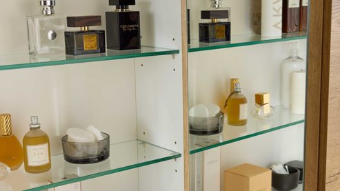 Der Spiegelschrank komplettiert das Badmöbel-Set funktional und optisch. Mit drei Türen, innen und außen verspiegelt, bietet er dir eine komfortable Rundumsicht für die tägliche Pflege. Im Inneren sorgen vier höhenverstellbare Glasböden für flexibel nutzbaren Stauraum.