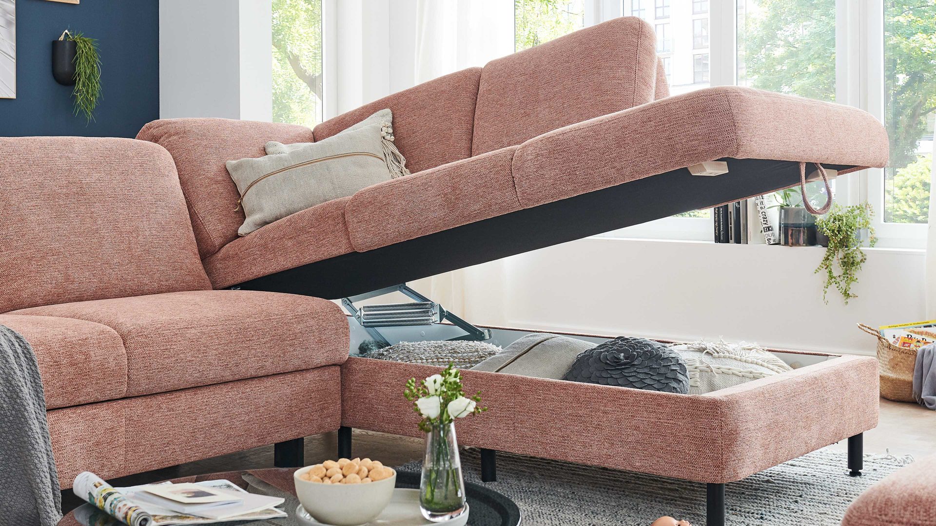 Dieser Bettkasten ist eine Mehrpreis-Funktion für die Kombielemente aus dem Modulmaster Programm MM-ZE1129. Dank seiner im originalen Stoff der Couch bezogenen Front fügt er sich absolut harmonisch ins Gesamtbild ein. Innen ist der aufklappbare Stauraum weiß beschichtet. Er bietet Ihnen eine praktische Aufbewahrungsmöglichkeit für Textilien wie Decken und Zierkissen, aber auch für Spiele, Kinderspielzeug und andere Gegenstände.