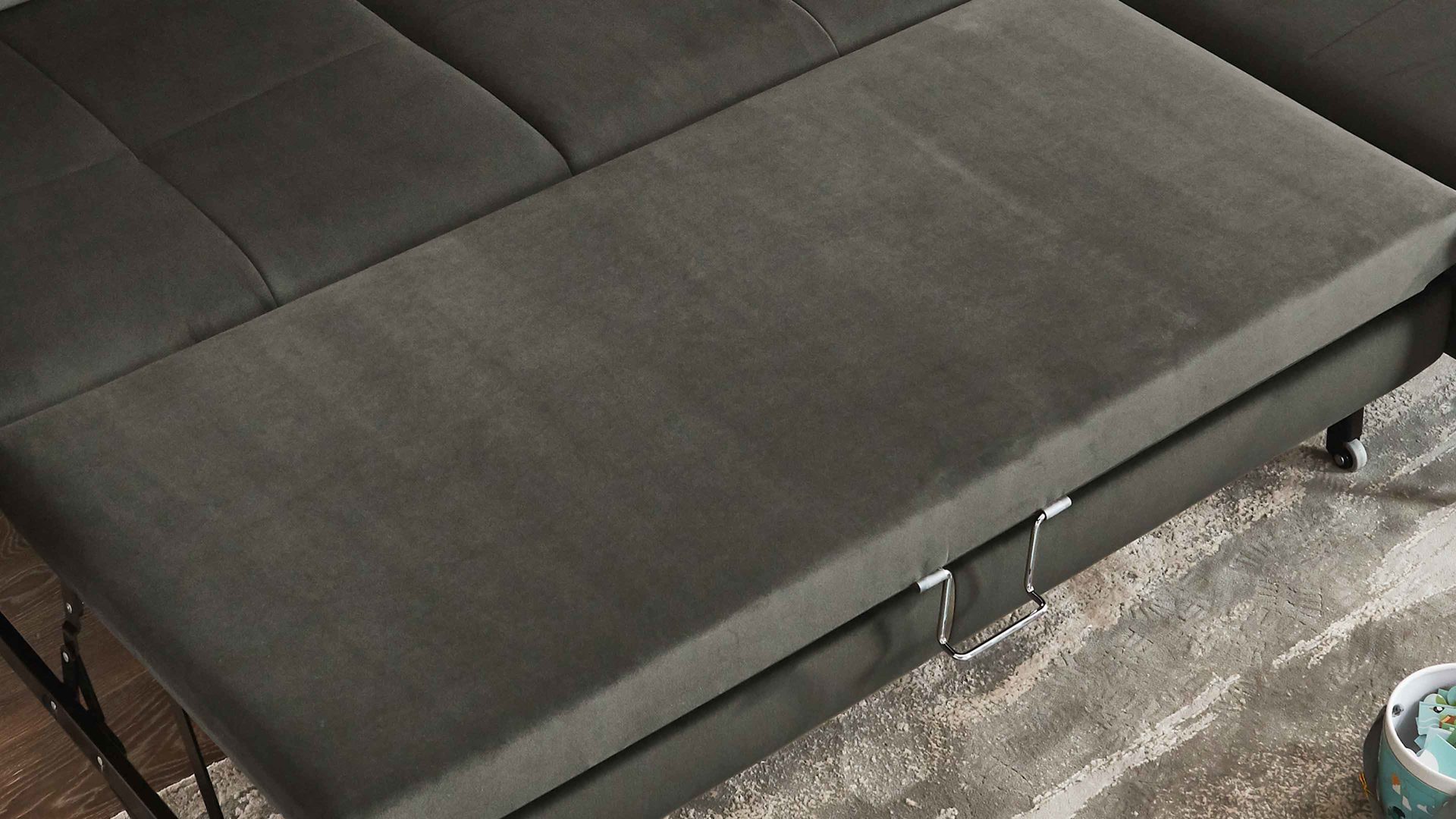 Die stilvolle Eckgarnitur aus der Modulmaster-Serie MM-ZE1156 kombiniert einen olivgrünen Stoffbezug in Samtoptik mit mattschwarzen Metallfüßen. Sie präsentiert sich modern-elegant designt.