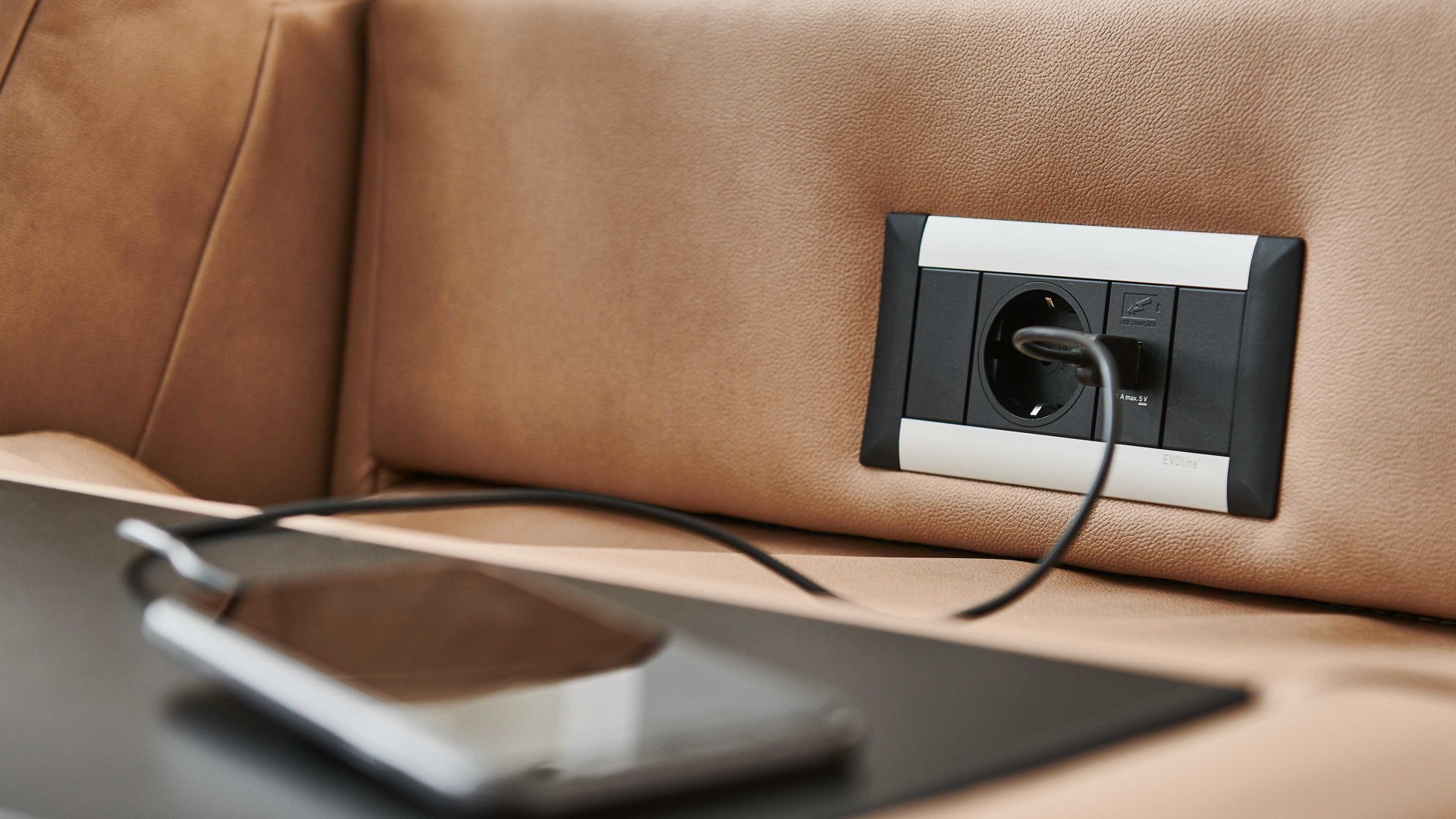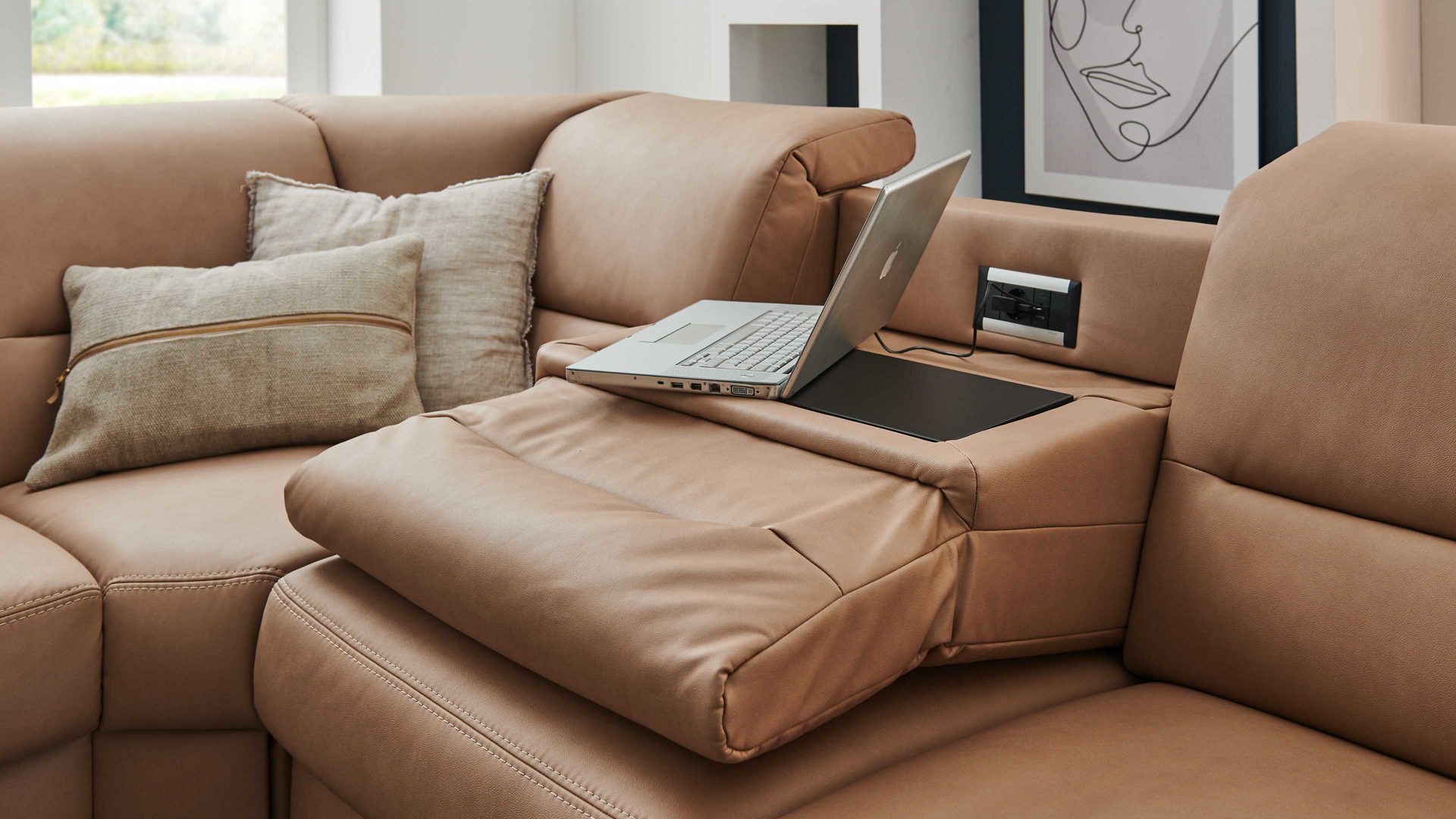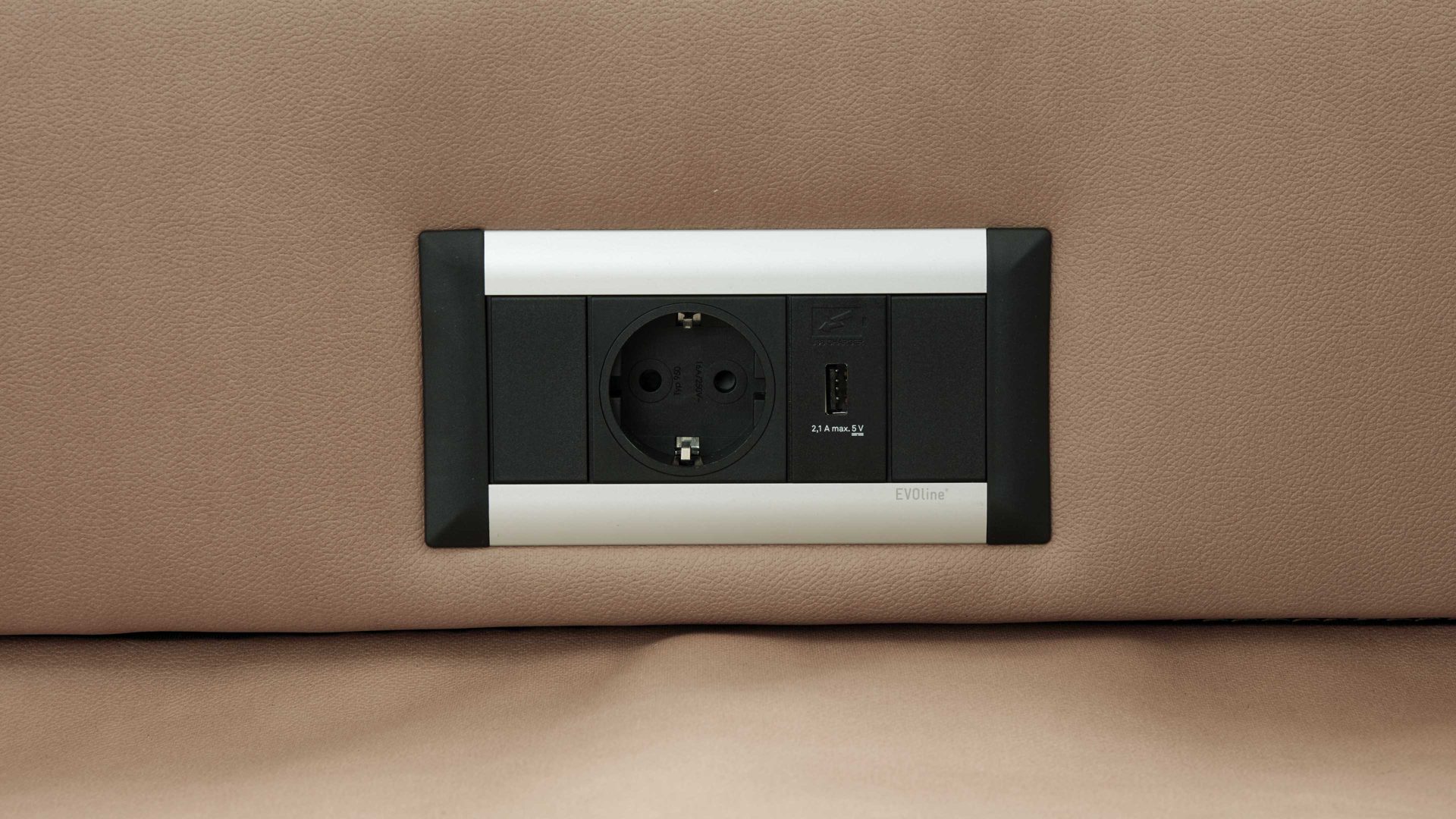Als zusätzliches Highlight sind in den Rückenteil des Sofas Funktionsbuchsen - genauer gesagt eine Steckdose und ein USB-Anschluss - integriert. Somit können Sie hier auch bequem Ihr Mobiltelefon aufladen oder Ihr Notebook anschließen.