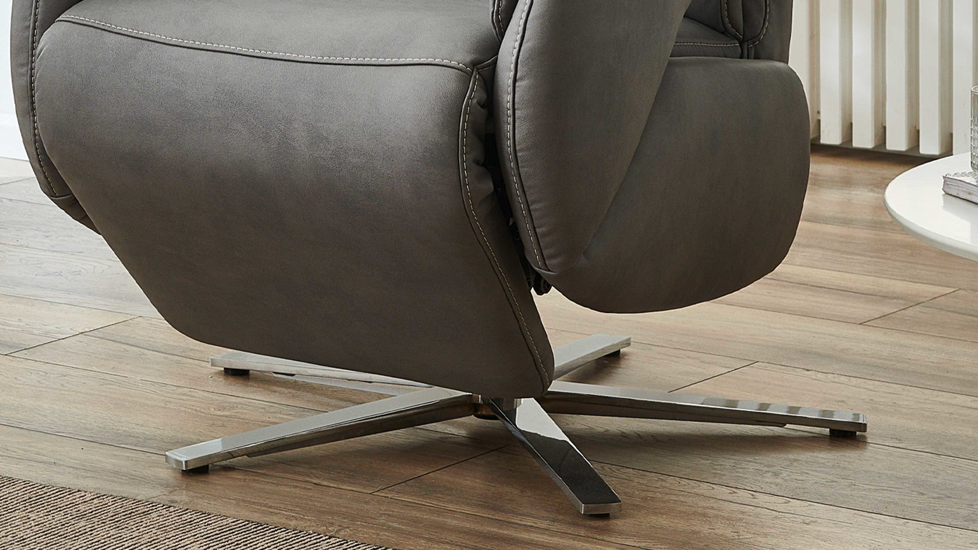 Er kombiniert einen edlen grauen Mikrofaserbezug in geprägter Lederoptik mit einem glänzend verchromten Metall-Sternfuß. Die Farben strahlen stilvolle Eleganz aus und harmonieren hervorragend miteinander. Darüber hinaus begeistert die hohe Qualität der Materialien: Der Bezug strapazierfähig und atmungsaktiv und der robuste Metallfuß sorgt für die nötige Standfestigkeit und Stabilität des TV-Sessels.