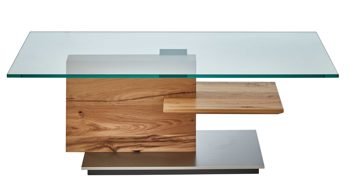 Der eindrucksvolle VENJAKOB Couchtisch 4420 zeichnet sich durch ein modernes Design, hohe Qualität sowie clevere funktionale Details aus. Er kombiniert eine 12 mm starke Kristallglasplatte mit einem erstklassig furnierten Unterbau in Eiche rustico hell geölt und einer stabilisierenden Bodenplatte in Edelstahloptik.