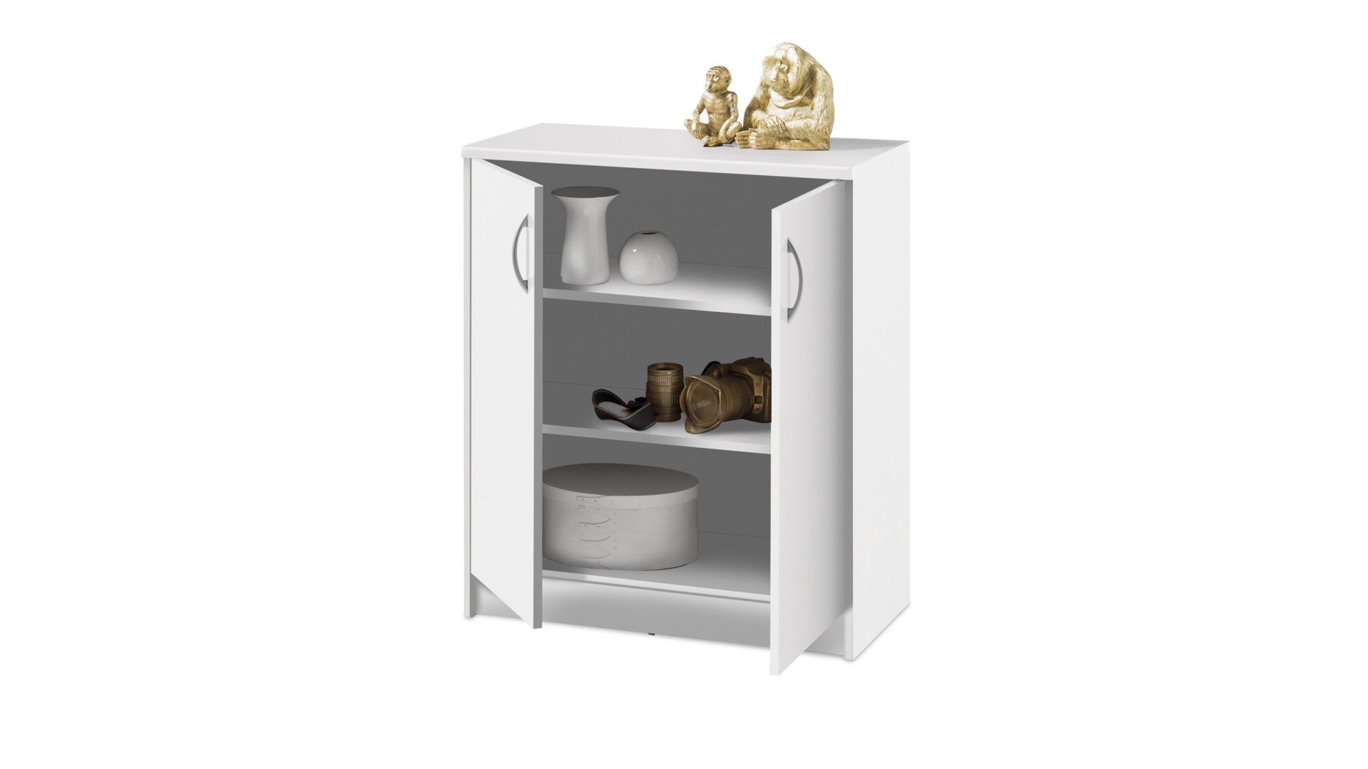 Sie möchten Ihr neues Geschirr übersichtlich und platzsparend verstauen? Sie haben eine Spielesammlung, die ihren eigenen Platz braucht? Oder Sie suchen eine Möglichkeit, Ihre Fotoalben ordentlich aufzubewahren? Dann ist diese schlichte Türenkommode genau das richtige Kleinmöbel für Sie. Kombinieren Sie die robusten weißen Kunststoffoberflächen sowie die alufarbenen Griffe mit warmen Holztönen oder kräftigen Farben. Es passt und sieht toll aus.