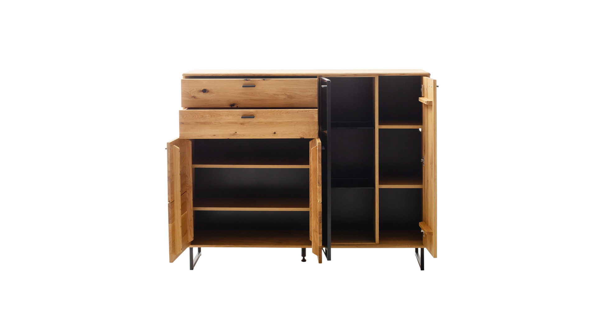 geölte Wildeiche, kombiniert mit geöltem Wildeiche-Furnier und anthrazitfarben lackierten Rückwänden