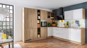 • Die Abbildung zeigt ein Wohnbeispiel, welches auch Dekoration sowie separat erhältliches Zubehör enthält. Im Lieferumfang enthalten ist eine Planküche Lux M4972130023011846.