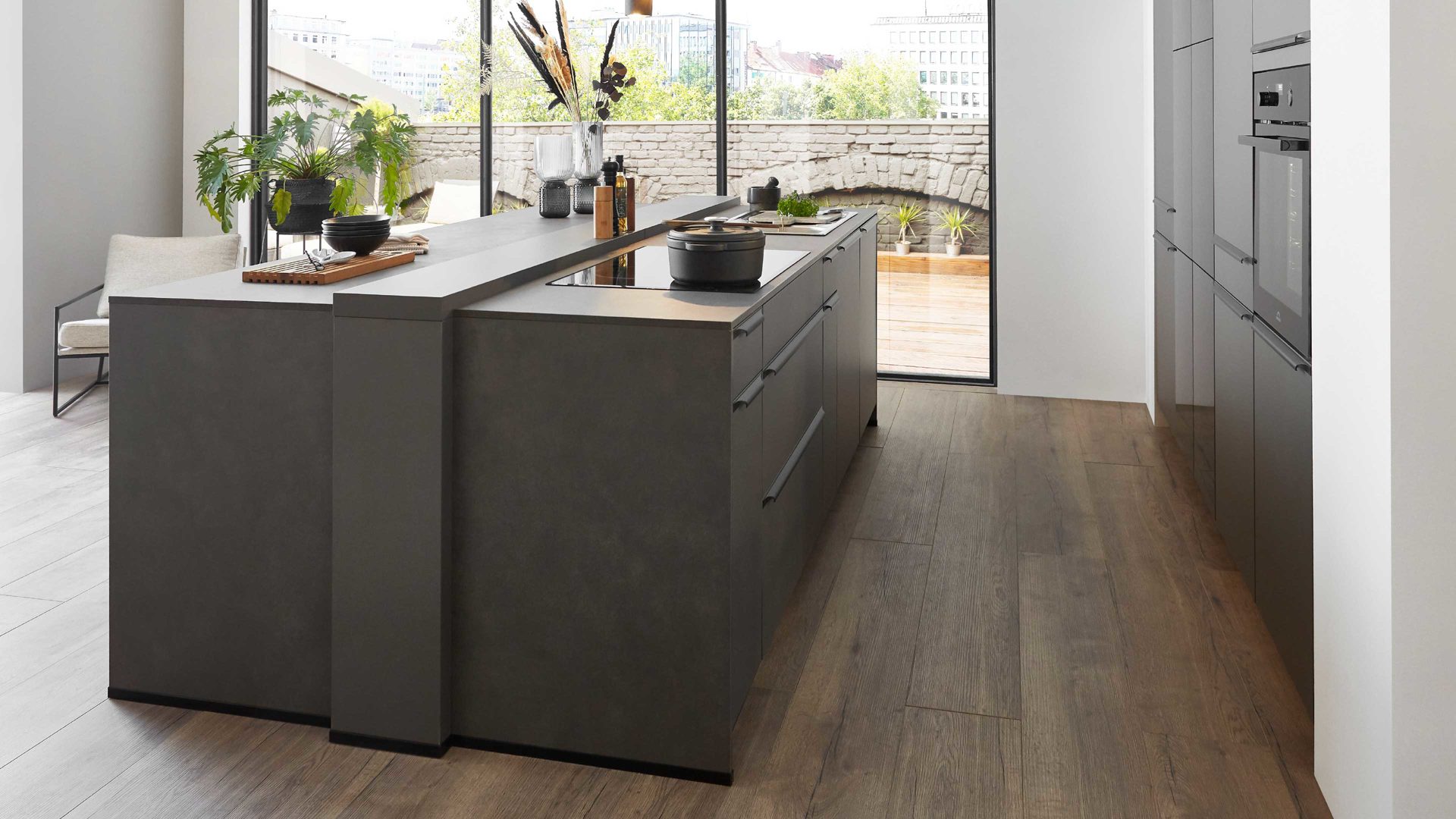 Die nobilia® Einbauküche Laser kombiniert mattes Vulkangrau als absolute Trendfarbe mit attraktiven Akzenten aus Schwarzglas.