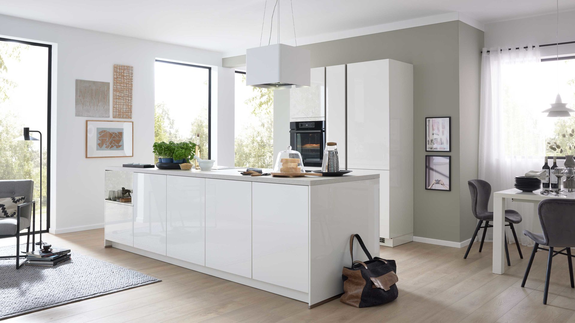 Für frische Luft beim Kochen sorgt der leistungsstarke Airforce Dunstabzug SQUAREWH, der mit der Energieeffizienzklasse B (Spektrum A+++ bis D) ausgezeichnet ist. Sein elegantes Design fügt sich nahtlos in das helle, moderne Gesamtbild der Küche ein.