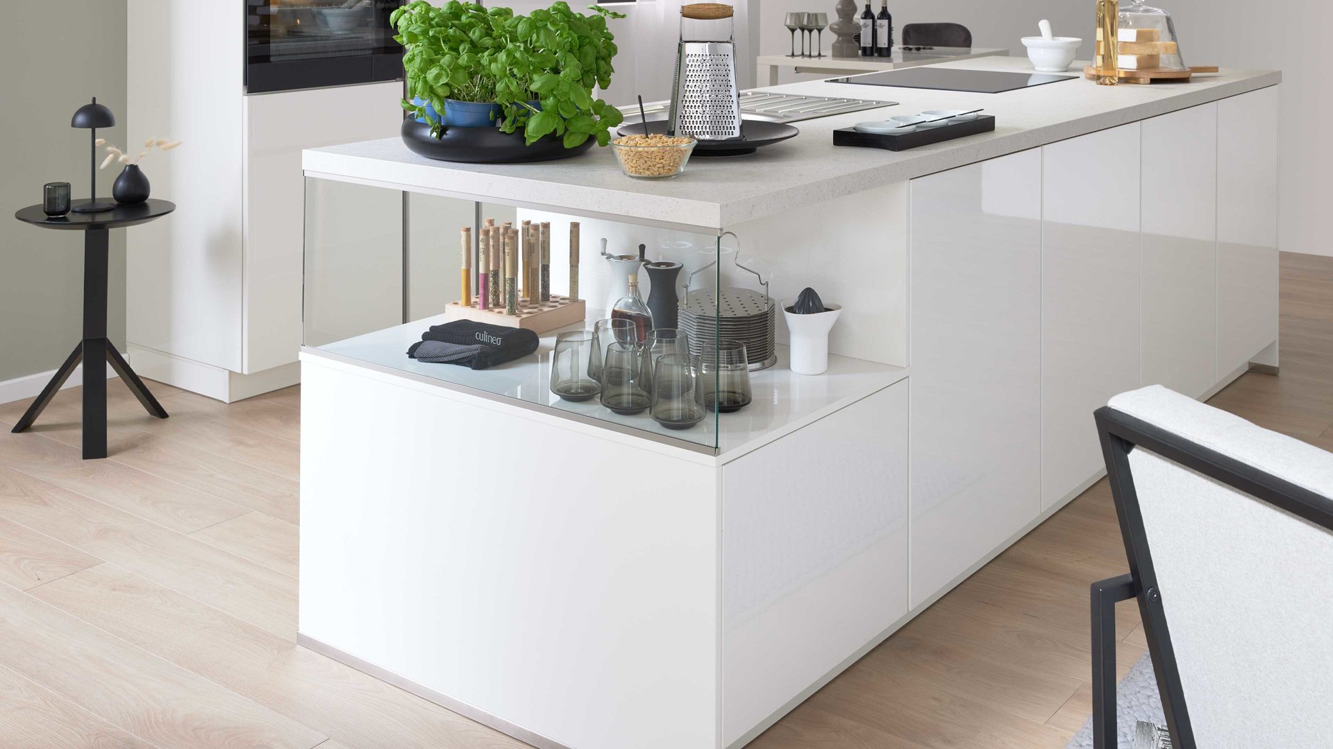 Culineo® Einbauküche C648 mit AEG Einbaugeräten – elegante Hochglanzküche in Weiß