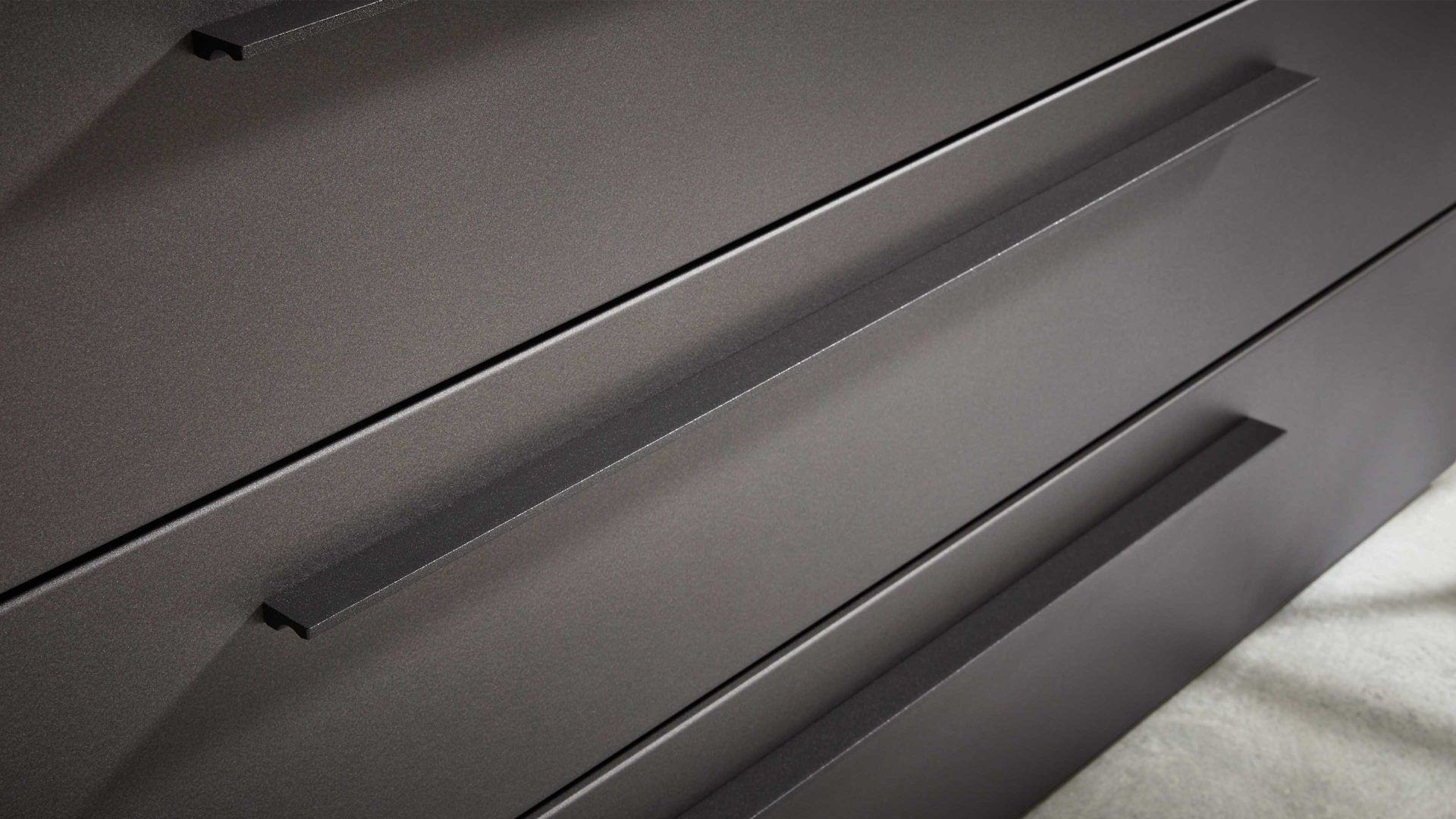 Die Schubladenkommode aus der Interliving Schlafzimmer Serie 1025 verbindet trendig-graphitfarbenen Mattlack mit robuster Balkeneiche gehackt – eine Kombination, die sowohl moderne Eleganz als auch gemütlich-natürlichen Charme ausstrahlt. Graphitfarbene Metallgriffe mit Eisenglimmerlack sorgen für stilvolle Akzente, während die grifflosen Holzfronten mit push-to-open-Funktion einen besonders cleanen Look schaffen.