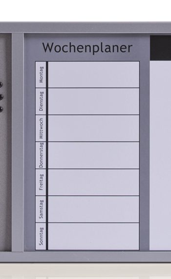 Dank der hilfreichen Kombitafel verlieren Sie nie den Überblick über Ihre Termine. Die Montage ist schnell und unkompliziert, das Montagematerial wird selbstverständlich mitgeliefert. Weitere Wochenplaner, Pinboards und Whiteboards sind in verschiedenen Ausführungen erhältlich.