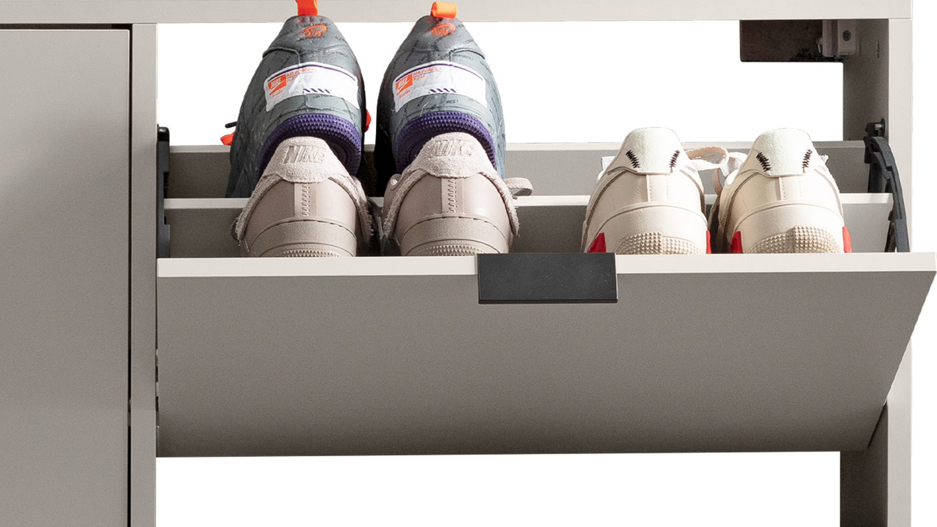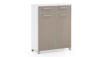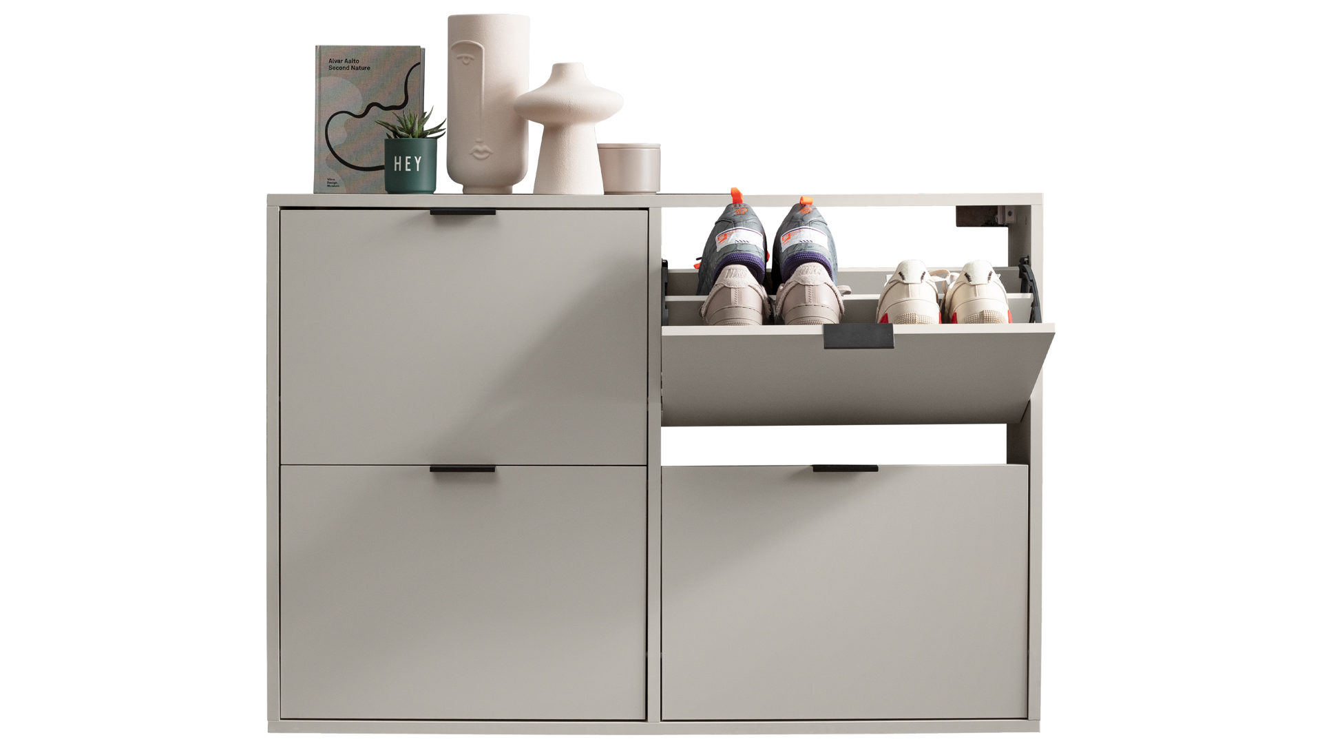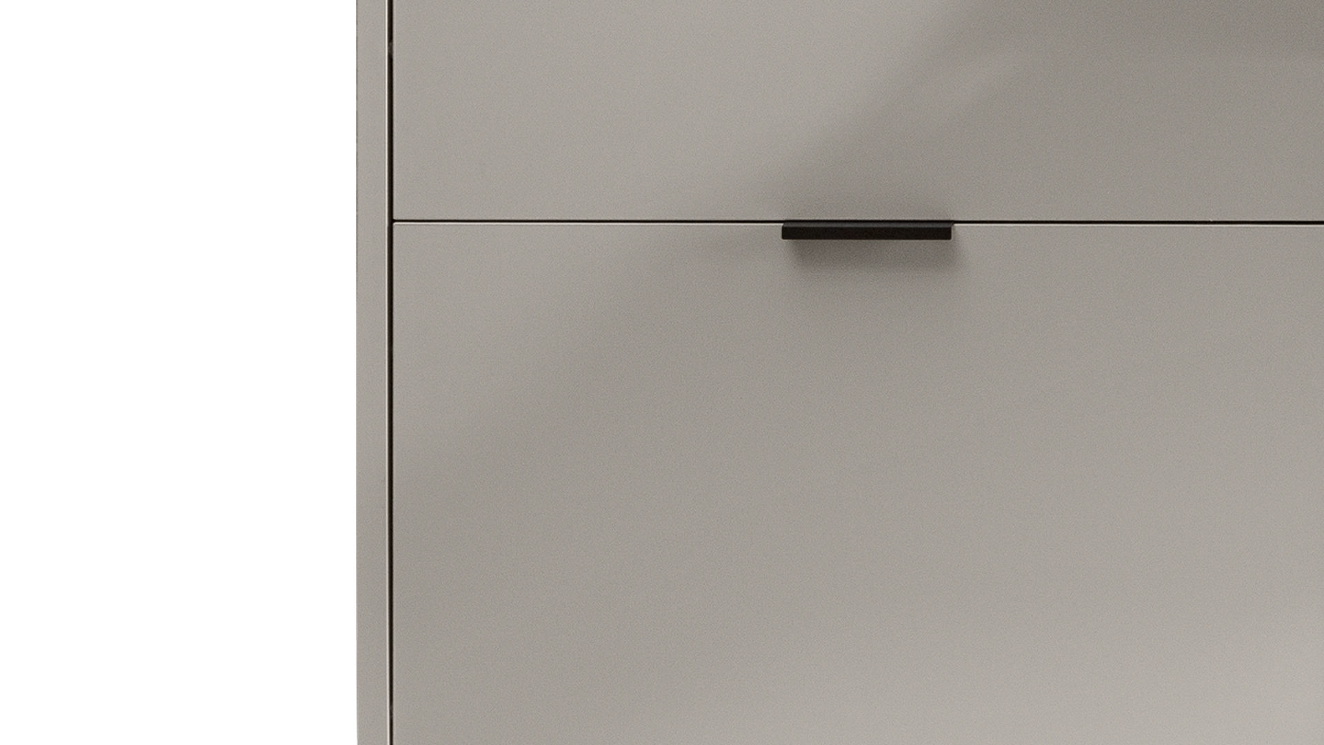 Mit seinen kreidegrauen Mattlackoberflächen verkörpert der Schuhschrank Bonnie moderne Eleganz. Schwarze Metallgriffe runden das stilvolle Design harmonisch ab. Zu den qualitativen Höhepunkten gehören überdies die widerstandsfähigen abgerundeten Dickkanten.