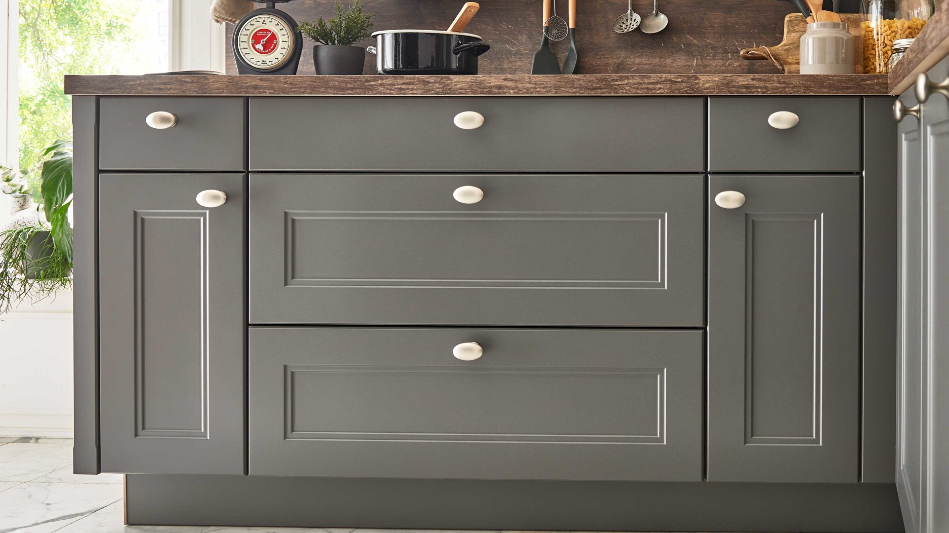 Durch die spezielle Frontgestaltung und die Knopfgriffe präsentiert sich die Planküche im modernen Landhausstil, der besonders gemütliches Flair in den Raum bringt. Sie strahlt klassische Eleganz mit akzentuierendem Naturcharme aus. Passend zu den Fronten sind auch die Korpusse und Sockelblenden in Quarzgrau gehalten.
