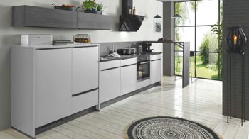 mattes Hellgrau, kombiniert mit brauner Eiche-Nachbildung und edelstahlfarbenen Metallgriffen