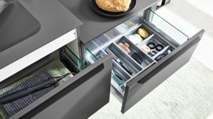 Alle Schubladen und Türen verfügen über Softclose-Technik mit Selbsteinzug, sodass alles leise und schonend schließt. Gleichzeitig handelt es sich um ein individuell planbares Badmöbelprogramm, mit dem du dein Bad passgenau und stilvoll gestalten kannst.