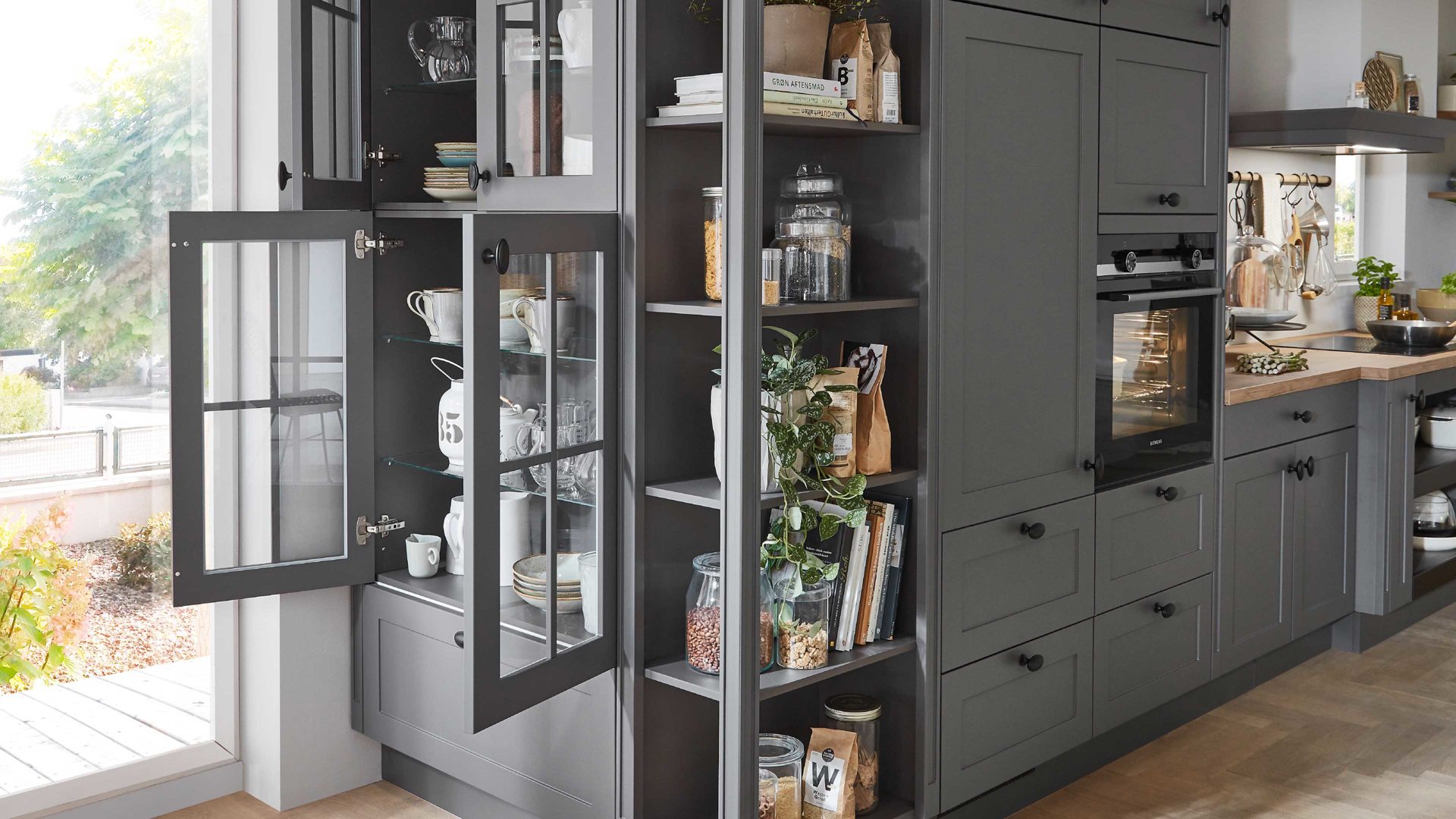 die geräumige Eckvitrine mit offenem Regal und Glasschränken, die vorgezogene Kochstelle sowie die Landhaus-Kaminhaube.
