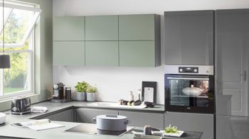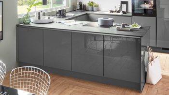 Die nobilia® Einbauküche Flash kombiniert die eindrucksvolle Eleganz von hochglänzendem Schiefergrau mit Akzenten in mattem Schilf.