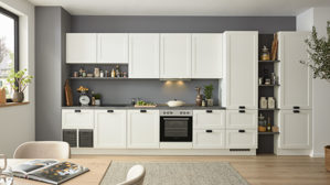 Culineo® Einbauküche C684 mit Einbaugeräten – moderner Landhausstil in Mattweiß und Schiefergrau