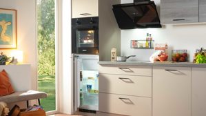 hochgebauter Backofen, vollintegrierter Kühlschrank und eine kopffreie Dunsthaube