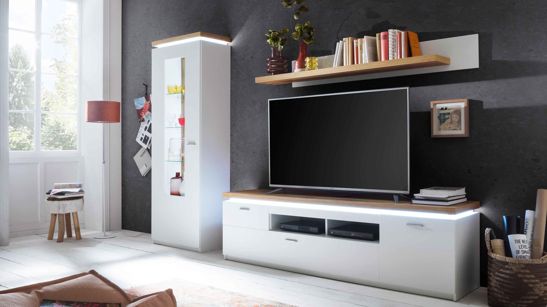 Die Gesamtmaße der Wohnwand 01 liegen bei ca. 280 x 198 x 44 cm (BxHxT). Highlights bilden die Dämpfung der Schubladen für lautloses Schließen und die Deckboden-Beleuchtung mit fest verbauten LED-Leuchtmitteln, die bereits inklusive ist und optisch wie funktional begeistert. Gegen Aufpreis lässt sich die Wohnkombination mit einer zusätzlichen LED-Beleuchtung und Funkfernbedienung ergänzen.