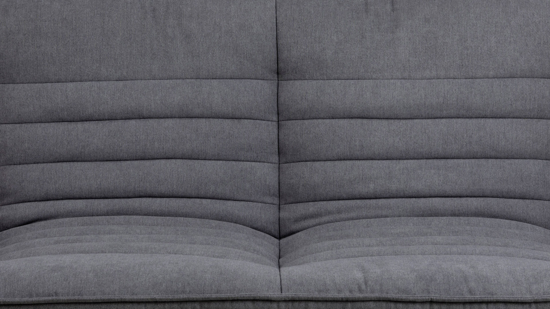 Dieses edle Schlafsofa mit weichem dunkelgrauen Stoffbezug und mattschwarz pulverbeschichteten Füßen lädt direkt zum Ausruhen, Schlafen und Träumen ein. Ungewöhnlich ist die futuristisch anmutende Form, die sehr reduziert und klar wirkt. Für Bequemlichkeit sorgen die üppigen Polster mit Steppnähten an Sitz- und Rückenfläche. Das Bettsofa bietet Sitzplatz für zwei Personen.
