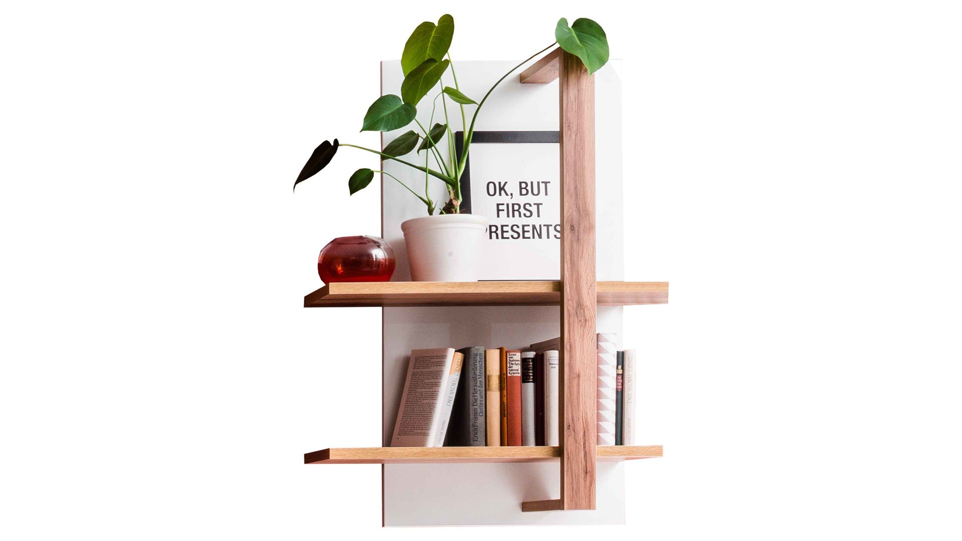 Auf den eichefarbenen Regalböden kommt Dekoratives hervorragend zur Geltung - sei es eine Vase, ein persönliches Bild in einem Stehrahmen, eine Reihe von Büchern oder ein anderes Element mit Eyecatcher-Potenzial oder gemütlicher Ausstrahlung. Das Regal mit weißer Rückwand misst ca. 65 x 96 x 26 cm (BxHxT).