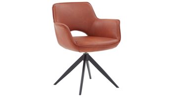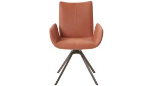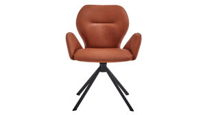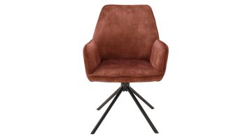 Der Armlehnen-Vierfußstuhl Ottawa kommt in einem ausdrucksstarken Design: Seine Sitzschale inklusive der gepolsterten Armlehnen ist komplett in einer edlen Vintage-Veloursoptik gehalten. Entlang aller Kanten ist der Stuhl mit Keder verstärkt. Der Velours in sanftem Rostbraun trifft auf vier mattschwarz lackierte Metallfüße. Einen spannenden Kontrast bildet die softe Oberfläche zu der geradlinigen Formensprache.