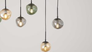 Mit der Hängelampe aus der Interliving Leuchten Serie 9350 bringst du ein echtes Design-Statement in deinen Wohnraum. Sechs organisch geformte, matte Glas-Lampenschirme in den Farbtönen Amber, Grün und Rauch sorgen für ein lebendiges Lichtspiel, während der mattschwarze Metallsockel und die schwarzen Textilkabel der Pendelleuchte einen modernen Look verleihen.