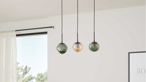 Mit der Hängelampe aus der Interliving Leuchten Serie 9350 bringst du ein echtes Design-Statement in deinen Wohnraum. DRei organisch geformte, matte Glas-Lampenschirme in den Farbtönen Amber, Grün und Rauch sorgen für ein lebendiges Lichtspiel, während der mattschwarze Metallsockel und die schwarzen Textilkabel der Pendelleuchte einen modernen Look verleihen.