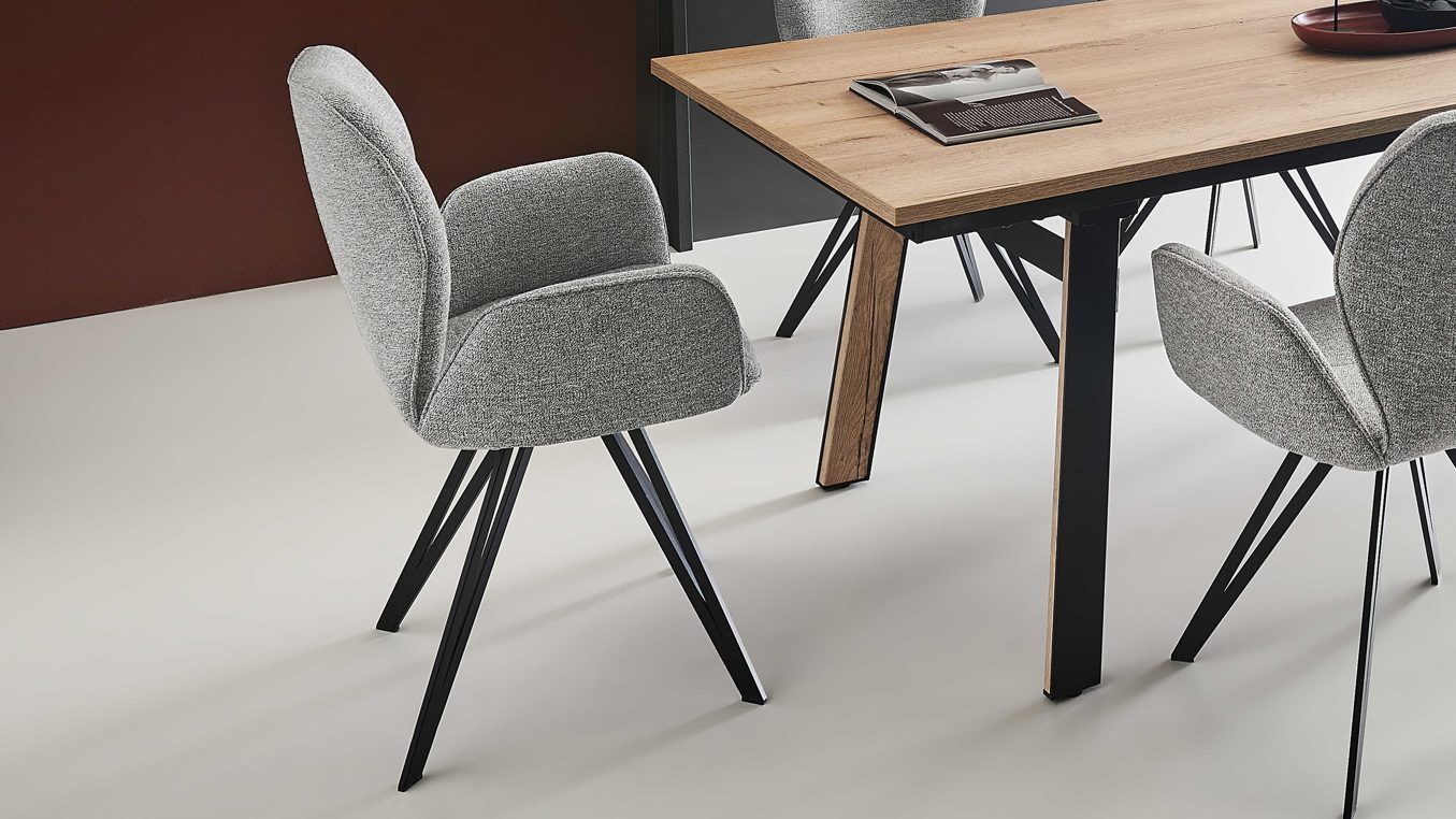 grau melierter Bouclébezug, kombiniert mit mattschwarzem Eisen