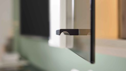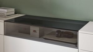 Aufsatz- und Unterbauregal für den Schreibtisch, kabellose Lademöglichkeit, Einbausteckdose und weitere dargestellte Einrichtungsgegenstände sind separat gegen Mehrpreis bestellbar.