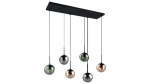 Mit der Hängelampe aus der Interliving Leuchten Serie 9350 bringst du ein echtes Design-Statement in deinen Wohnraum. Sechs organisch geformte, matte Glas-Lampenschirme in den Farbtönen Amber, Grün und Rauch sorgen für ein lebendiges Lichtspiel, während der mattschwarze Metallsockel und die schwarzen Textilkabel der Pendelleuchte einen modernen Look verleihen.