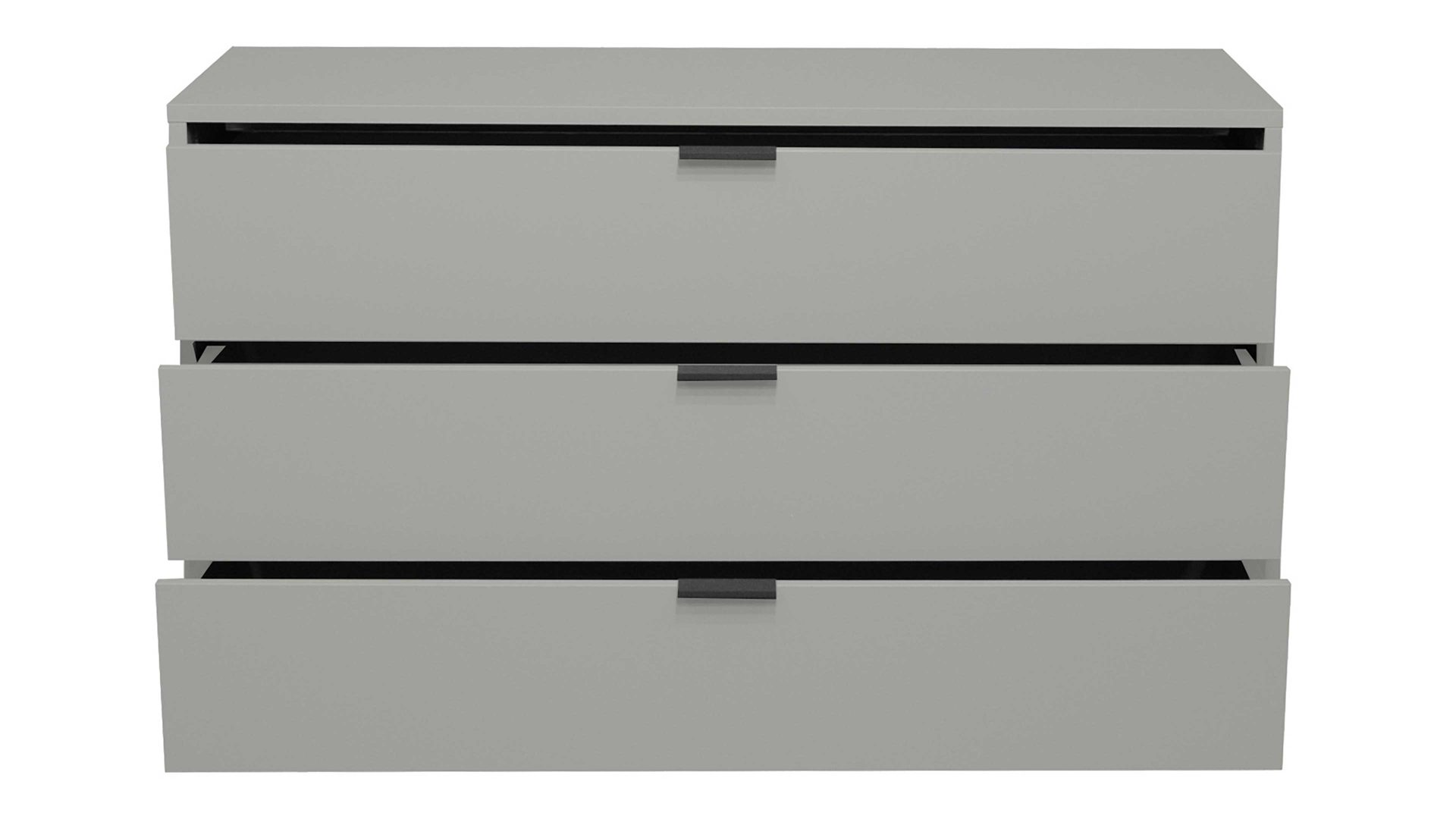 Mit ihren kreidegrauen Mattlackoberflächen verkörpert die Schubladenkommode Bonnie moderne Eleganz. Schwarze Metallgriffe und praktisch höhenverstellbare Möbelgleiter runden das stilvolle Design harmonisch ab. Zu den qualitativen Höhepunkten gehören überdies die widerstandsfähigen abgerundeten Dickkanten.