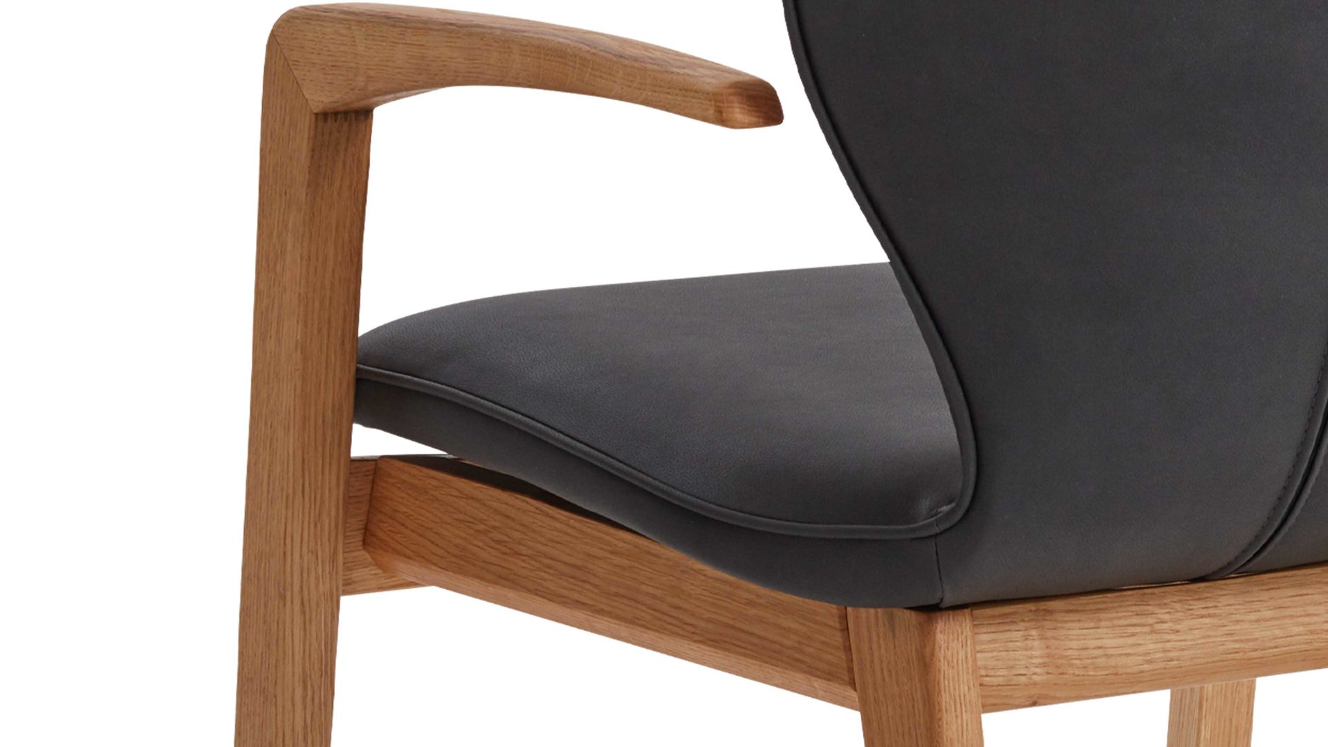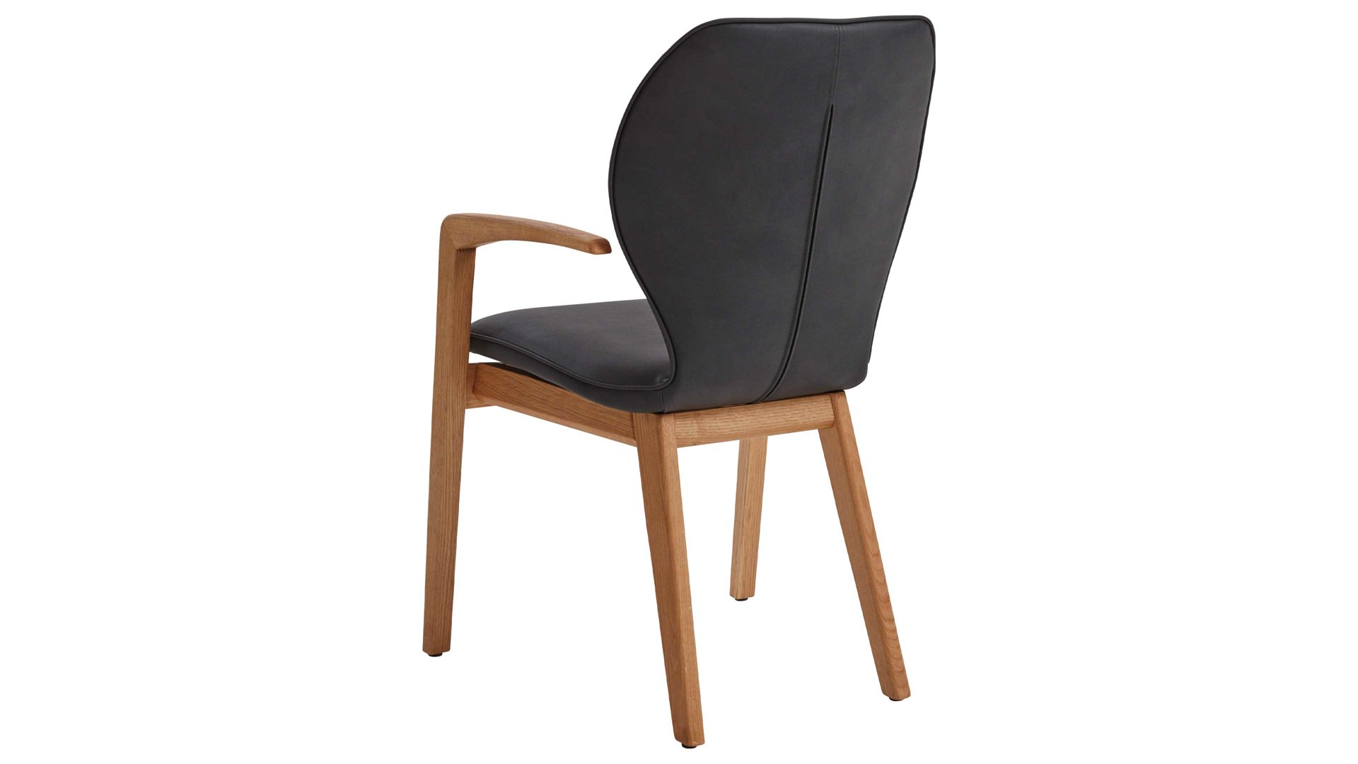 Das massive Eiche-Vierfußgestell verleiht dem Stuhl nicht nur Stabilität, sondern auch eine natürliche und warme Ausstrahlung. Die Kombination aus dem dunklen Bezug und dem hellen Holz schafft einen ansprechenden Kontrast, der sich nahtlos in verschiedene Einrichtungsstile einfügt.