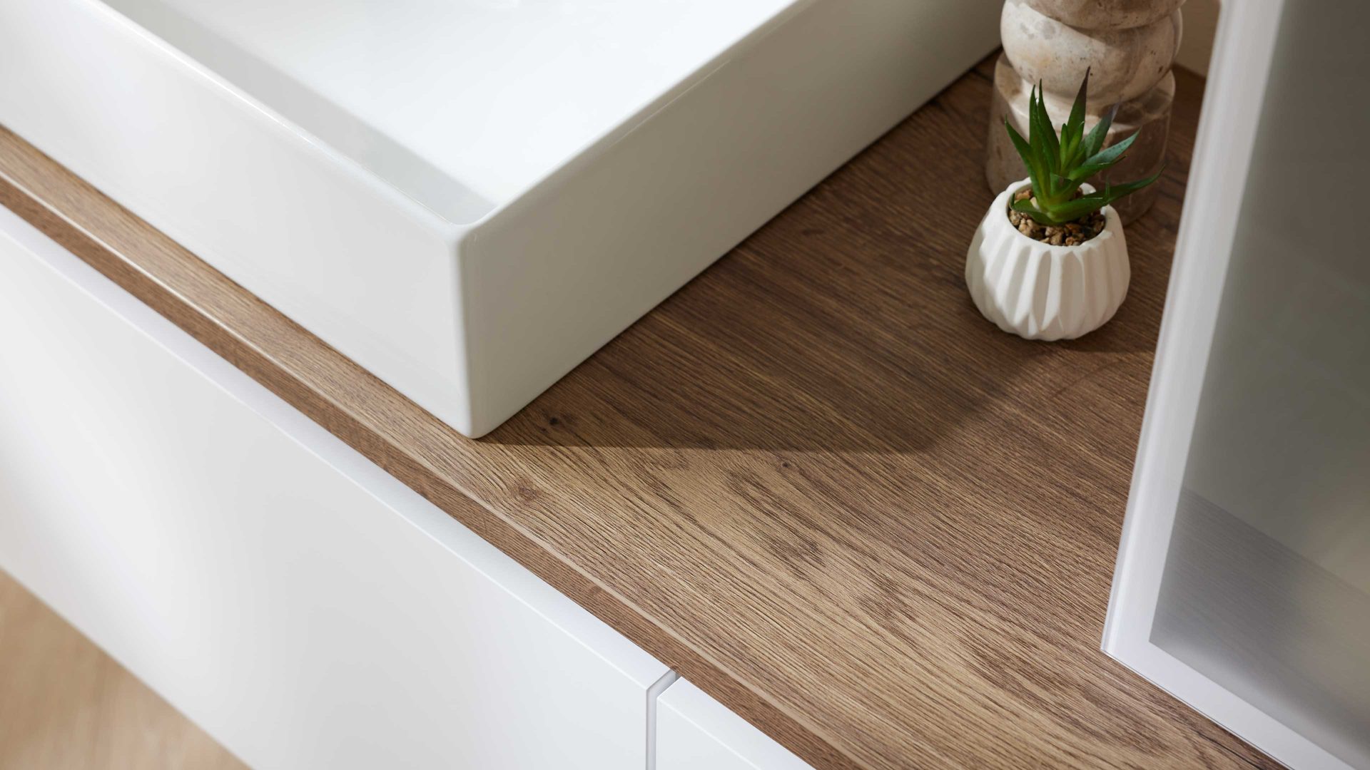 Der Auszugschrank (Typ 67355) bietet zusätzlichen Stauraum bei kompakten Maßen von ca. 60 x 36 x 46 cm (B/LxHxT). Er ist inklusive Abschlusswange (Typ 16786) ausgestattet, Glas-Seitenverblendungen sind optional erhältlich. Die Waschtischplatte (Typ 16849) mit passendem Waschtischausschnitt (Typ 9352) rundet das Möbelensemble ab.