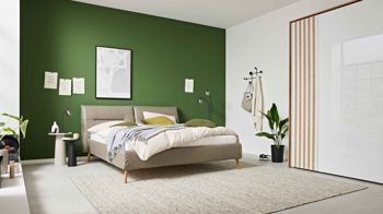 Wenn du dein Bett frei im Raum platzieren möchtest, empfiehlt sich die Ausführung mit rückseitigem Originalbezug. So wirkt dein Schlafzimmer offener und moderner. Helle Stoffe wie Naturweiß lassen Räume zusätzlich größer und ruhiger wirken.